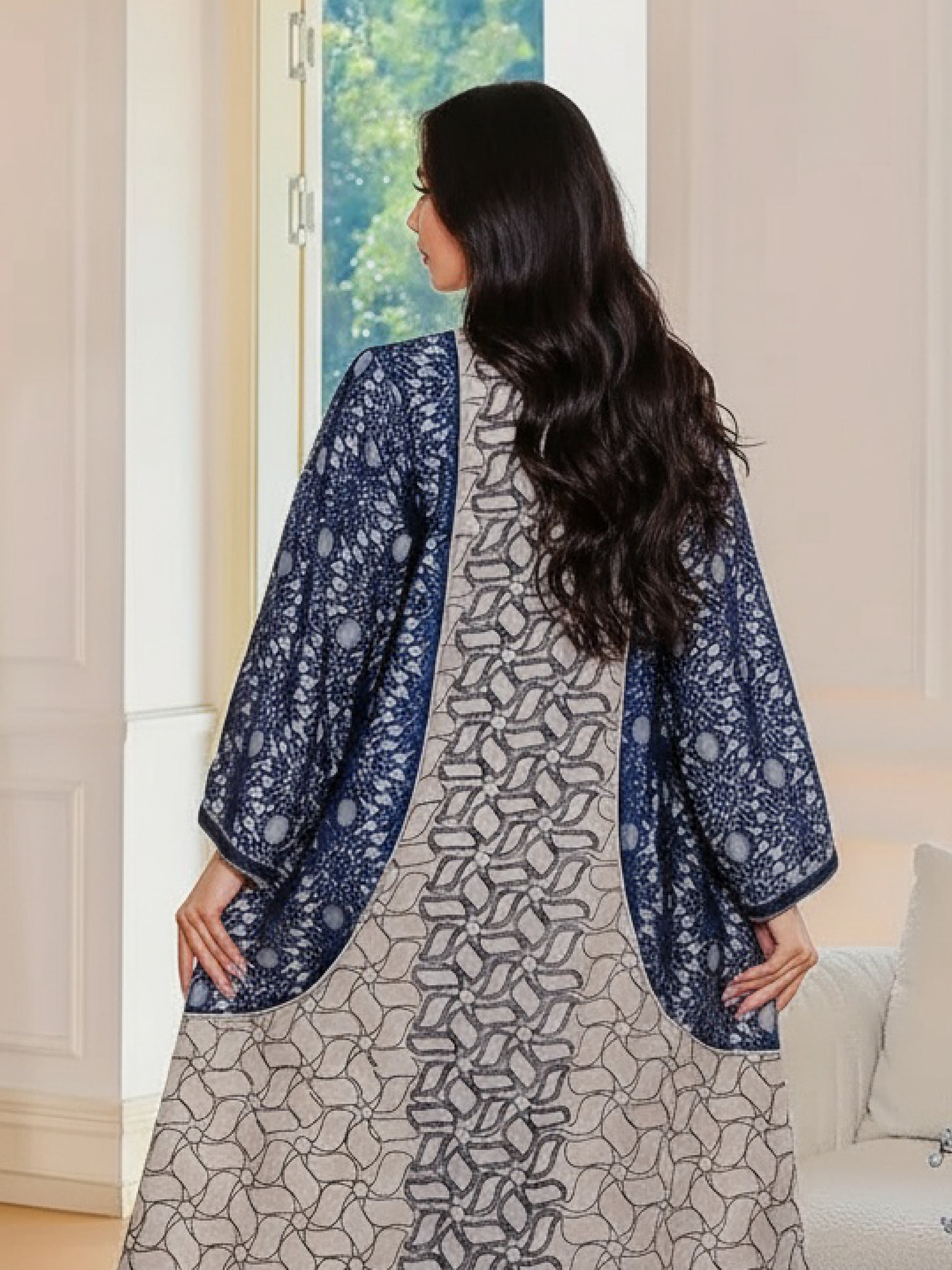 Abaya ZY-012 Beige with Navy Pattern