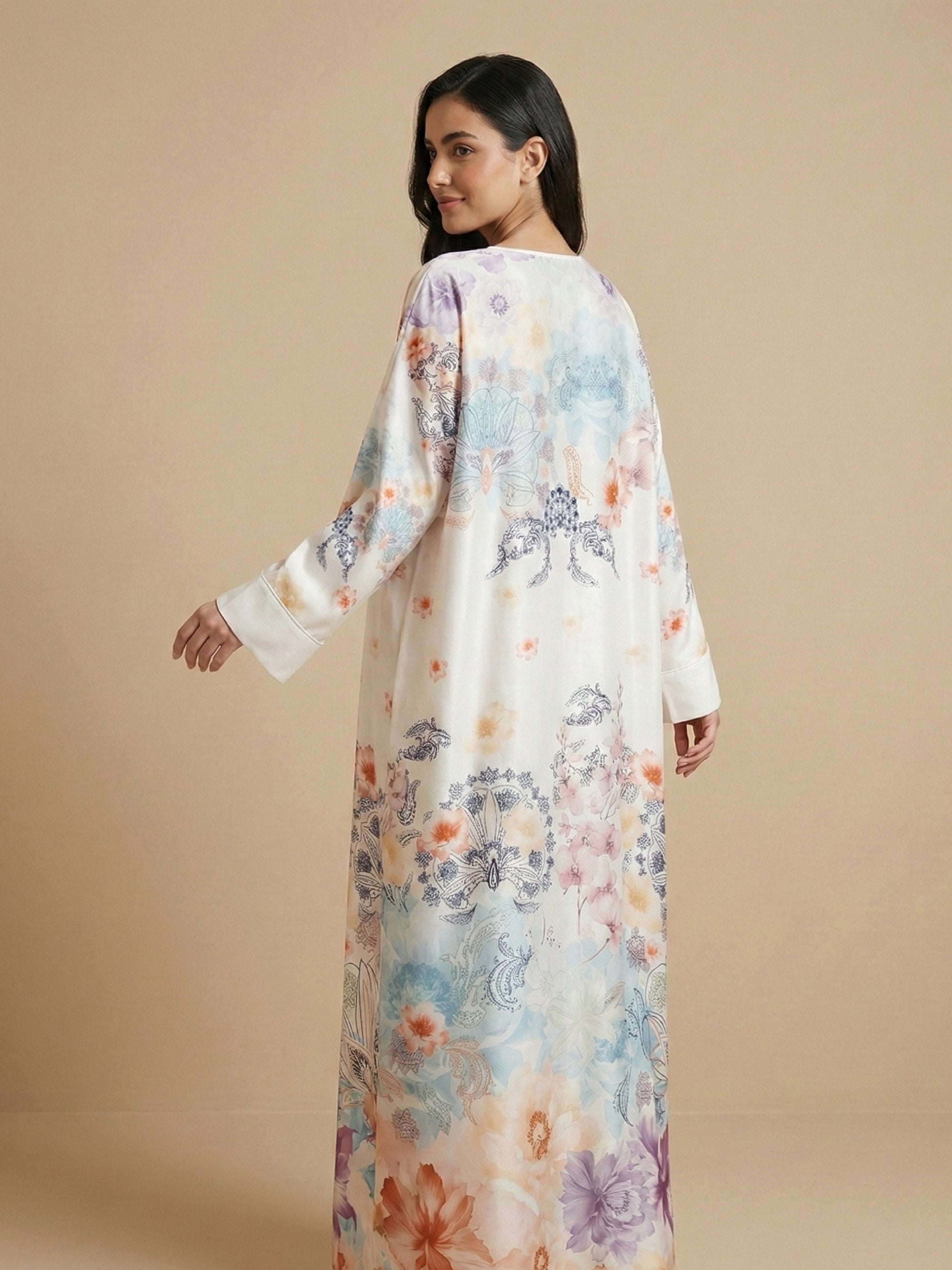 A soft pastel print jalabiya with a flowing silhouette and delicate artistic patterns, designed for a graceful and effortlessly elegant everyday look