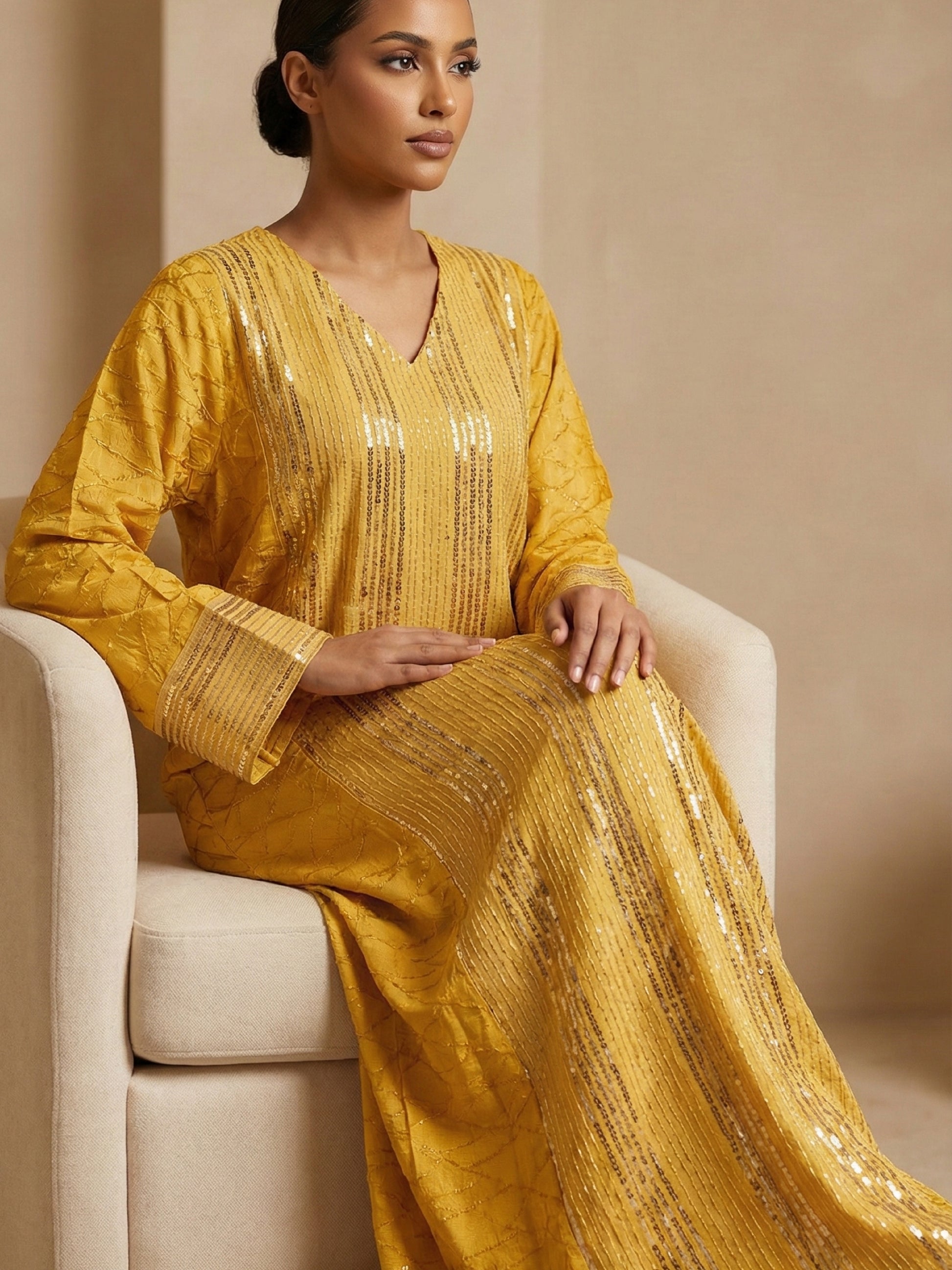 An elegant yellow jalabiya featuring a refined silver sequin panel for a subtle, luminous finish. Designed with a flowing silhouette and lightweight fabric, it offers effortless comfort and timeless sophistication—perfect for evening wear and special occasions.