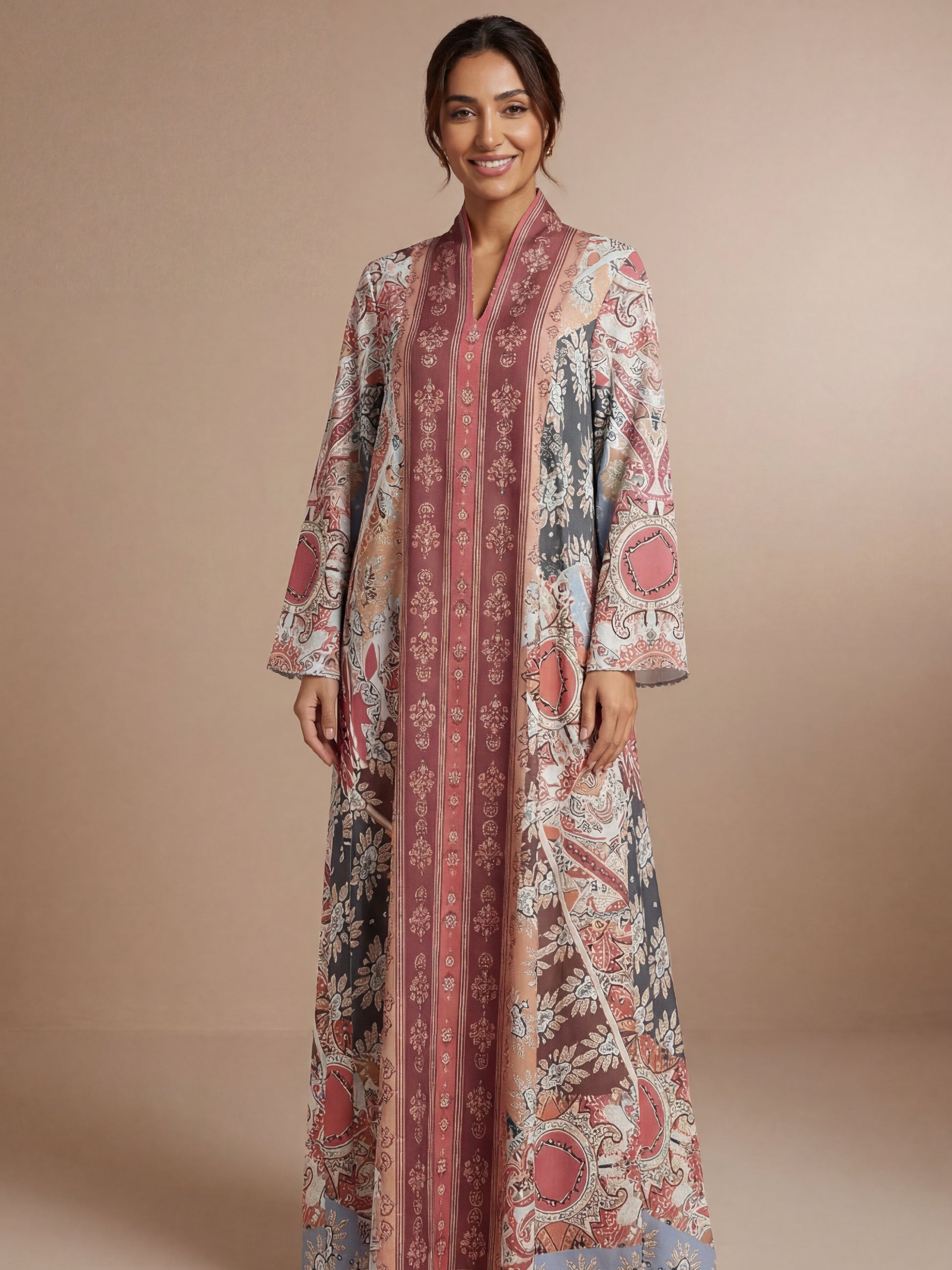 An elegant printed jalabiya featuring harmonious rose-toned patterns and intricate detailing, designed to deliver refined charm with graceful movement.