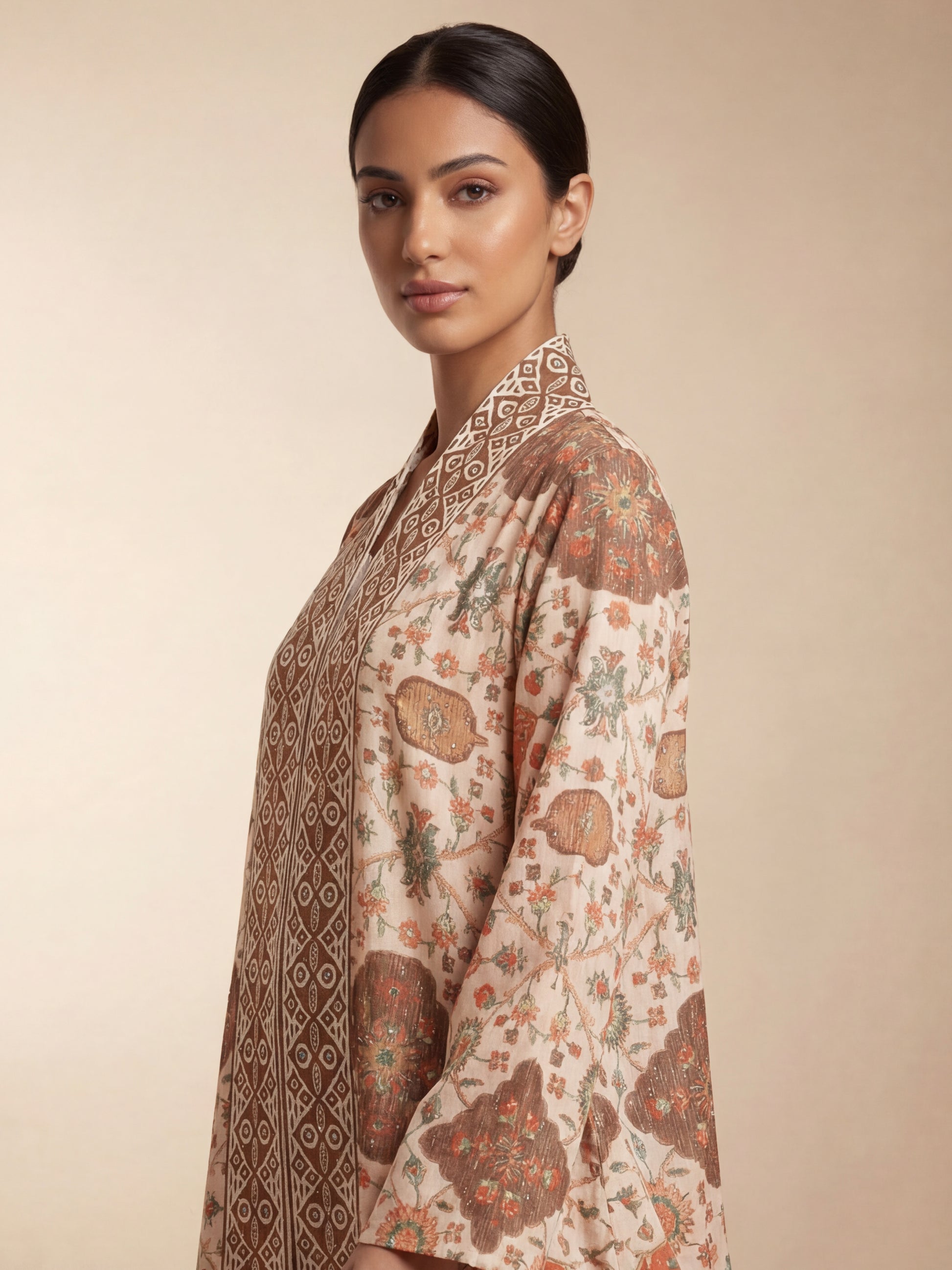 A refined jalabiya featuring intricate heritage-inspired patterns with a striking geometric panel running along the front. The rich earthy tones and detailed motifs create a timeless cultural aesthetic.