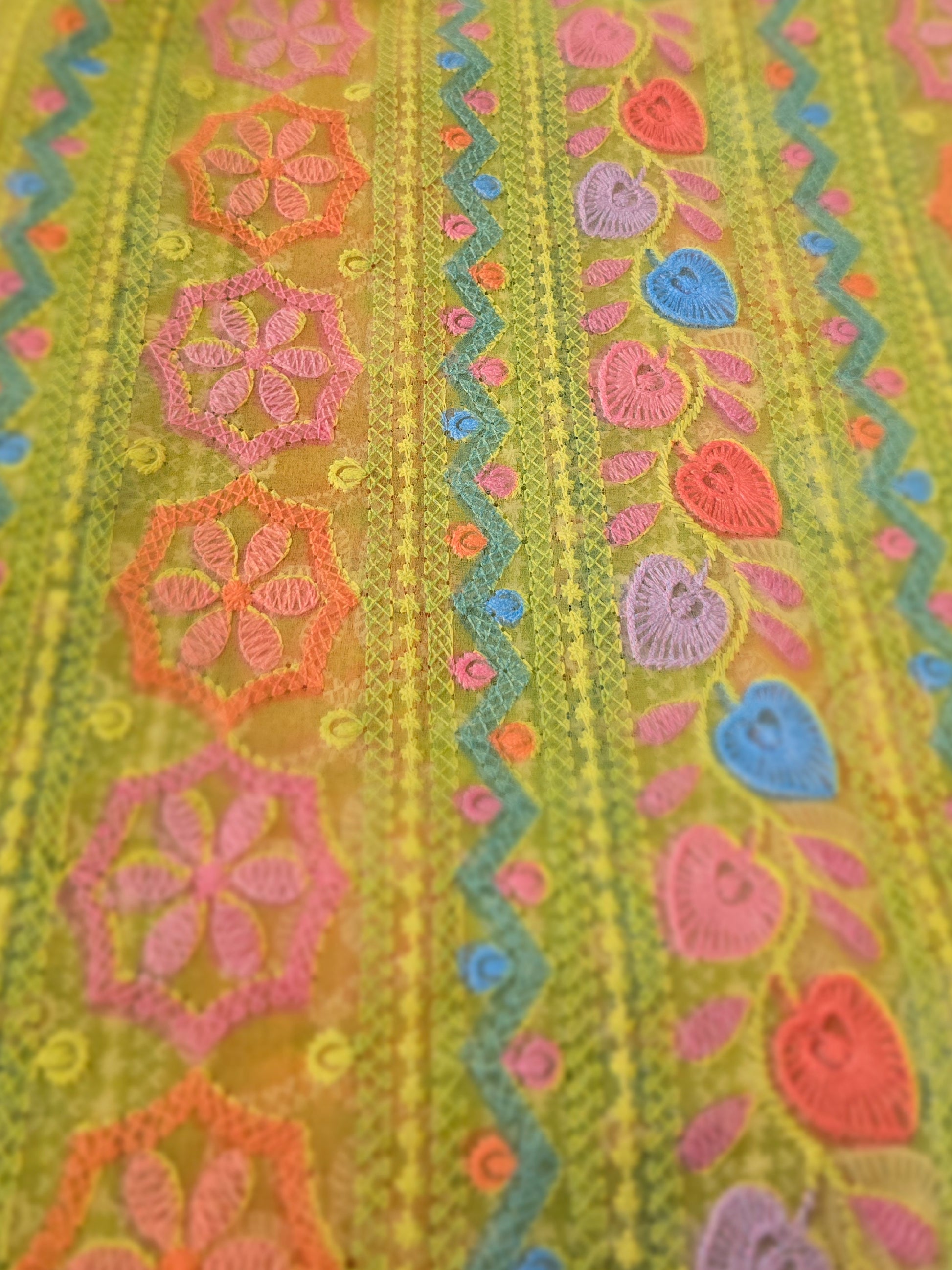 Vibrant unstitched mukhawer fabric crafted from lightweight chiffon in a lively lime green tone. The fabric features colorful Indian-inspired embroidery in turquoise, orange, and pink with delicate geometric and floral motifs. The beautifully decorated neckline panel adds a striking focal point to the design. The soft chiffon fabric drapes gracefully, making it perfect for tailoring elegant jalabiya or mukhawer styles with a bold and festive look